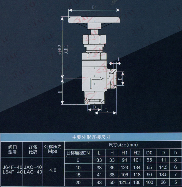 J表示截止閥 L表示節(jié)流閥 A表示結(jié)構(gòu)形式為直角式 C表示插焊連接 40代表公稱壓力為4.0MPa 40后不標注代表代表閥體材質(zhì)為鍛鋼。