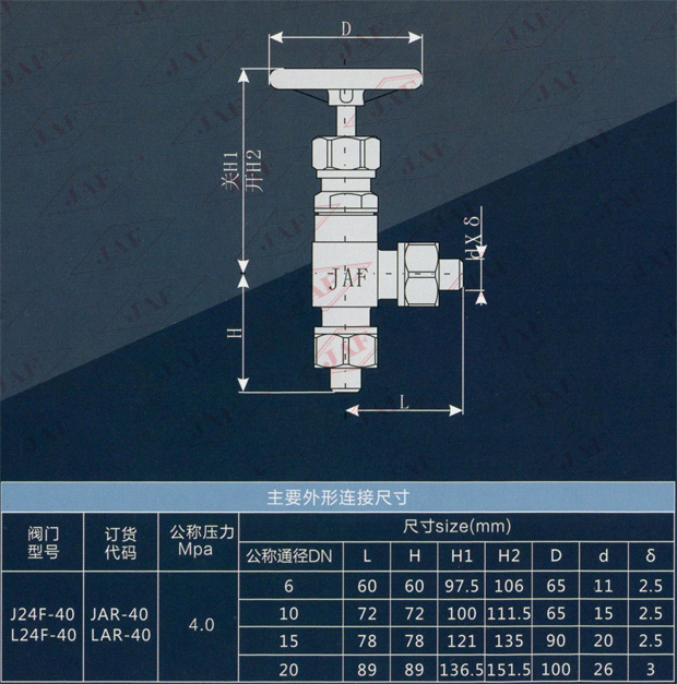 J表示截止閥 L表示節(jié)流閥 A表示結(jié)構(gòu)形式為直角式 G表示管接頭連接 40代表公稱壓力為4.0MPa 40后不標注代表代表閥體材質(zhì)為鍛鋼。